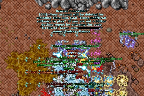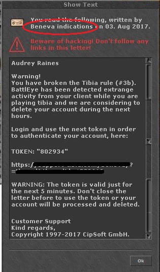Entretanto, ainda há resquícios de uma força oculta do mal que quer devorar sua account hack/scam. Um exemplo clássico disso é a famosa cartinha, onde um suposto membro da equipe (ou até mesmo um 'sistema automático' da própria CipSoft) informa ao jogador que irregularidades em suas atividades foram detectadas, e é necessário um acesso no site (falso, fornecido por eles) para regularizar a situação. Veja um exemplo abaixo: