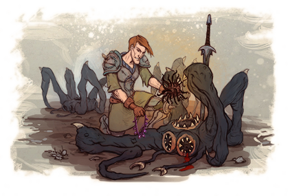 Tibicus colocou um anel de invisibilidade e se esgueirou escadaria abaixo, pois queria surpreendê-lo. Não demorou muito e logo encontrou o Paladino ajoelhado perto de uma pilha de Yielothax mortos. Viu que Fridolin já havia preparado algumas bolsas para as pilhagens e decidiu dar uma olhada nelas. Para sua surpresa, as bolsas estavam bem vazias em comparação ao montante de pilhagens que coletara no andar de cima e assim que estava para tirar o anel e revelar-se, viu que Fridolin estava guardando as pilhagens mais preciosas para si.