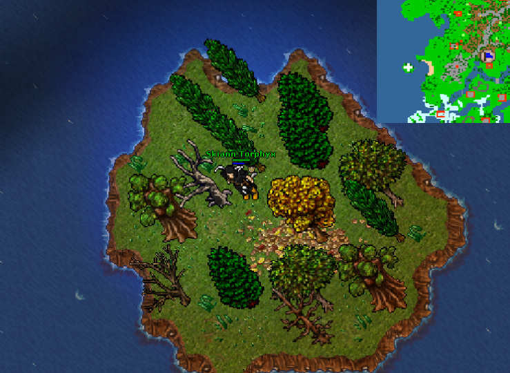 Para chegar até essa pequena ilha, tem que descer para área da quest e passar por duas Giant Spiders; o rope spot fica ao sul das GS. É possível abrir a árvore seca; então, caso precise esconder algo, por exemplo, lootbag e itens, caso esteja red com alguém vindo te matar ou algo do tipo, pode usar essa árvores e correr para longe que dificilmente alguém encontrará seus pertences ;).