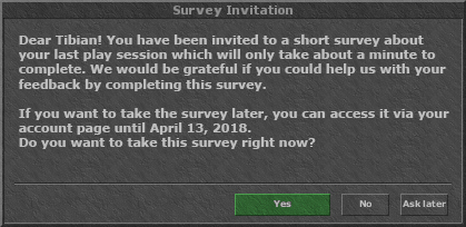 Quando você recebe tal convite para uma pesquisa, os tópicos são de grande relevância para nós, e nós apreciamos muito as suas respostas. Obrigado, Tibianos, por nos informar o que você pensa!