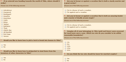 Então aqui está a história. Pouco antes de abril, enviamos convites para uma pesquisa na qual fizemos algumas perguntas rápidas. Explicamos que estamos constantemente pensando em novos recursos e conteúdo para enriquecer a sua experiência no Tibia - o que é realmente verdade - e então fizemos algumas perguntas, sugerindo idéias um pouco estranhas...