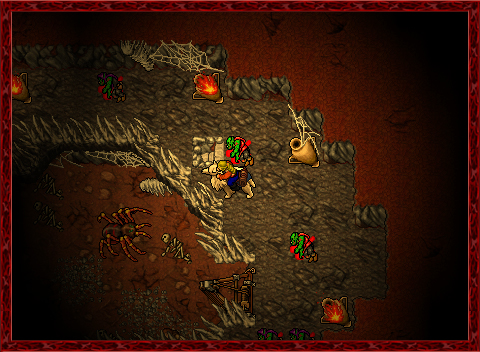 Tentou recordar as palavras exatas de sua missão. Se ela lembrava-se corretamente, era esperado que destruísse todos os ovos de aranha que haviam sido incubados pela aranha gigante que os orcs haviam conseguido capturar. Olhando para o poço, ela confirmou, esta aranha realmente parecia estar presa. Então era aí que a missão dela começaria. Respirou fundo. Tentou descobrir uma maneira de chegar aos ovos de aranha que tinha visto lá atrás de algumas teias, evitando uma briga com aquela fera. Ela não conseguia ver nenhuma maneira de contornar isso, no entanto.