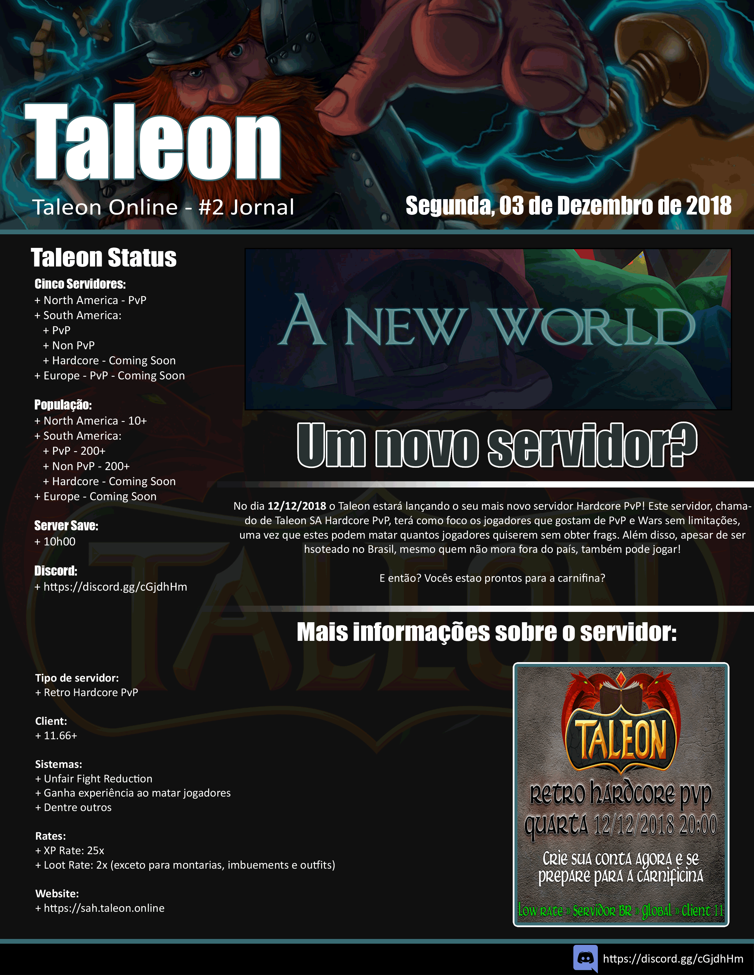 A segunda edição do Jornal Taleon trás as seguintes manchetes: lançamento de servidor Retro Hardcore PvP SA e Retro Open PvP EU; Como foram os eventos da primeira Black Friday do servidor; Momentos épicos relacionados à War/PvP, level up e caça aos bosses!