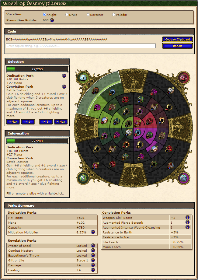 Os Presets também podem ser importados e exportados, e você também pode compartilhar suas configurações com amigos ou transferi-las para outro personagem. - O WoD Planner é uma ferramenta no site do Tibia que ajuda a personalizar o preset do seu personagem. Ele permite selecionar uma vocação e distribuir pontos para ver onde eles irão te levar.