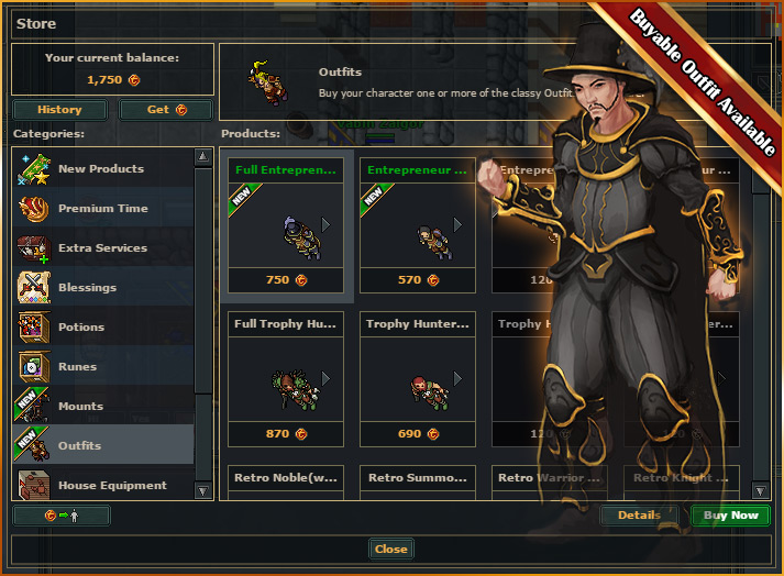 O outfit Entrepreneur poderá ser obtido na Store por 750 Tibia Coins (outfit completo). Antes de ser adicionado a Store, este outfit foi dado em uma oferta especial, para os jogadores que comprassem 90, 180 ou 360 dias de premium time de 01 de fevereiro até 15 fevereiro de 2012.