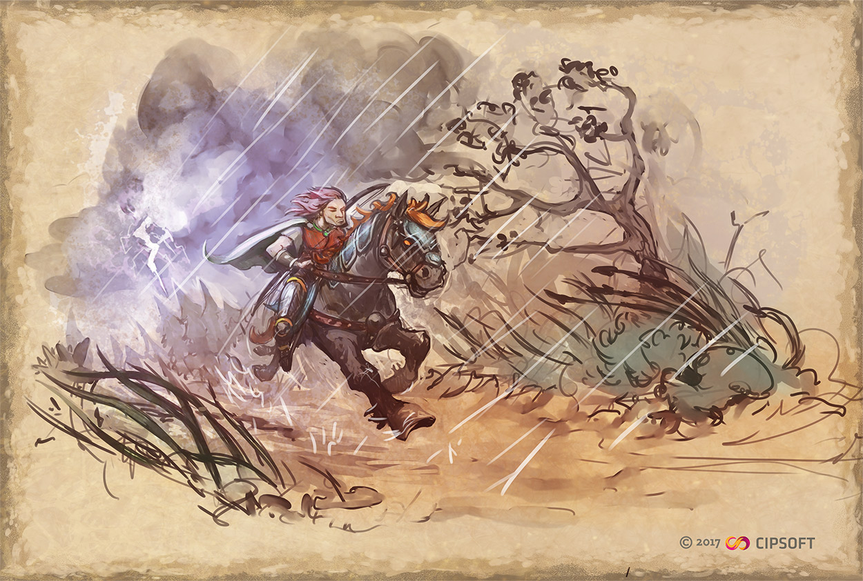 A lua estava no seu pico. Volumosa e brilhante, em qualquer outra noite, ela teria sido uma bênção para um viajante. Nesta noite, no entanto, ela estava coberta pela tempestade que surgiu de Roshamuul. Seu brilho agora só está visível num halo estranho surgindo das nuvens, pesadas e carregadas de trovões, e serve apenas para amedrontar quem se aventura nessas condições. Apenas aqueles que não tem nada a perder se arriscariam no relento durante uma tempestade vinda de Roshamuul. Nada a perder, ou temendo pela vida de outros.