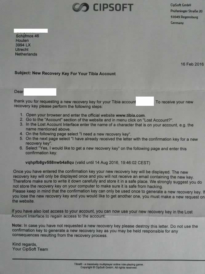 No caso do jogador ter perdido a Recovery Key, ele poderá solicitar uma nova no webshop do Tibia. Após pagar o valor cobrado pelo serviço, a empresa enviará uma carta para o endereço cadastrado em sua conta. Nesta carta há uma Confirmation Key (chave de confirmação), que você irá utilizar no site oficial do jogo para conseguir uma nova Recovery Key.