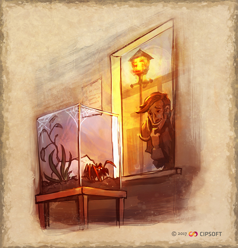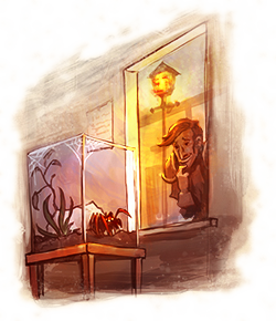 Quando ele finalmente terminara de se preparar e dirigiu-se para o navio, ele olhou através de uma das janelas abertas das casas em Thais; em um dos quartos, ele viu um terrário com pequena aranha emergindo alegremente de sua pedrinha. “Oh, se você fosse maior e mais forte... Essas criaturas seriam um banquete para você ”. Ele pensou. Tibicus continuou a caminhar em direção ao porto quando, de repente, ele teve uma epifania.